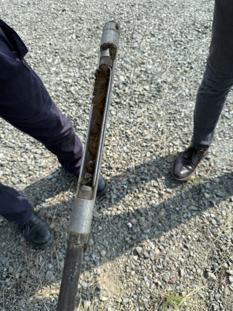 ポイント調査している途中に即時に出るデータを調査士と会話しながら、調査杭の先の土を手で触り触り状況を確かめてくださいます。